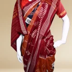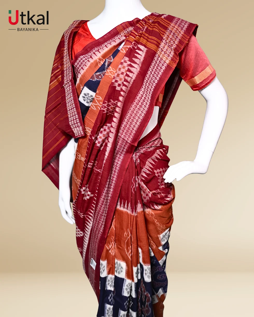 The Bomkei, Sapta, and Floral Ikat Saree is a fine handloom creation from Odisha, blending three distinctive weaving styles in one masterpiece. The Bomkei border adds intricate threadwork, the Sapta designs bring traditional symbolic motifs, and the floral patterns enhance its grace with nature-inspired detailing. Woven with the traditional Bandha (tie-dye) technique, this saree is a beautiful expression of Odisha’s rich cultural heritage. Elegant, soft, and easy to drape, it is ideal for weddings, festive occasions, and cultural gatherings.