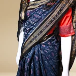 The Garnet and Black Sambalpuri Ikat Saree is a striking handwoven creation from Odisha, blending deep garnet tones with a bold black contrast. Designed using the traditional Bandha (tie-dye) technique, it features intricate motifs inspired by nature and culture. Lightweight, soft, and elegant, this saree is perfect for festive occasions, cultural gatherings, or refined everyday wear.